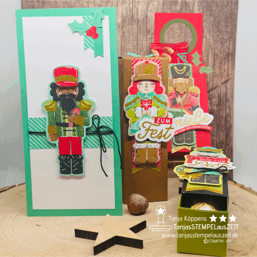 Ich habe mir für dich 4 schnell Verpackungen bzw. Karte ausgedacht. Dekoriert werden sie mit den Nussknacker-Anhänger.