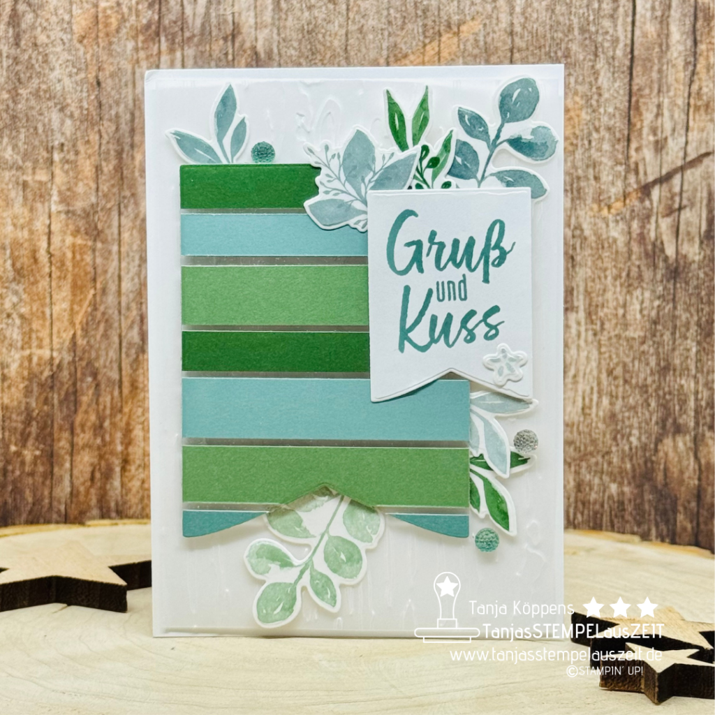Benutzt habe ich die tollen STANZFORMEN PARTY-WIMPEL und für die Zweige unser neues MOTIVKLEBEBAND BLÄTTER UND BOTSCHAFTEN.